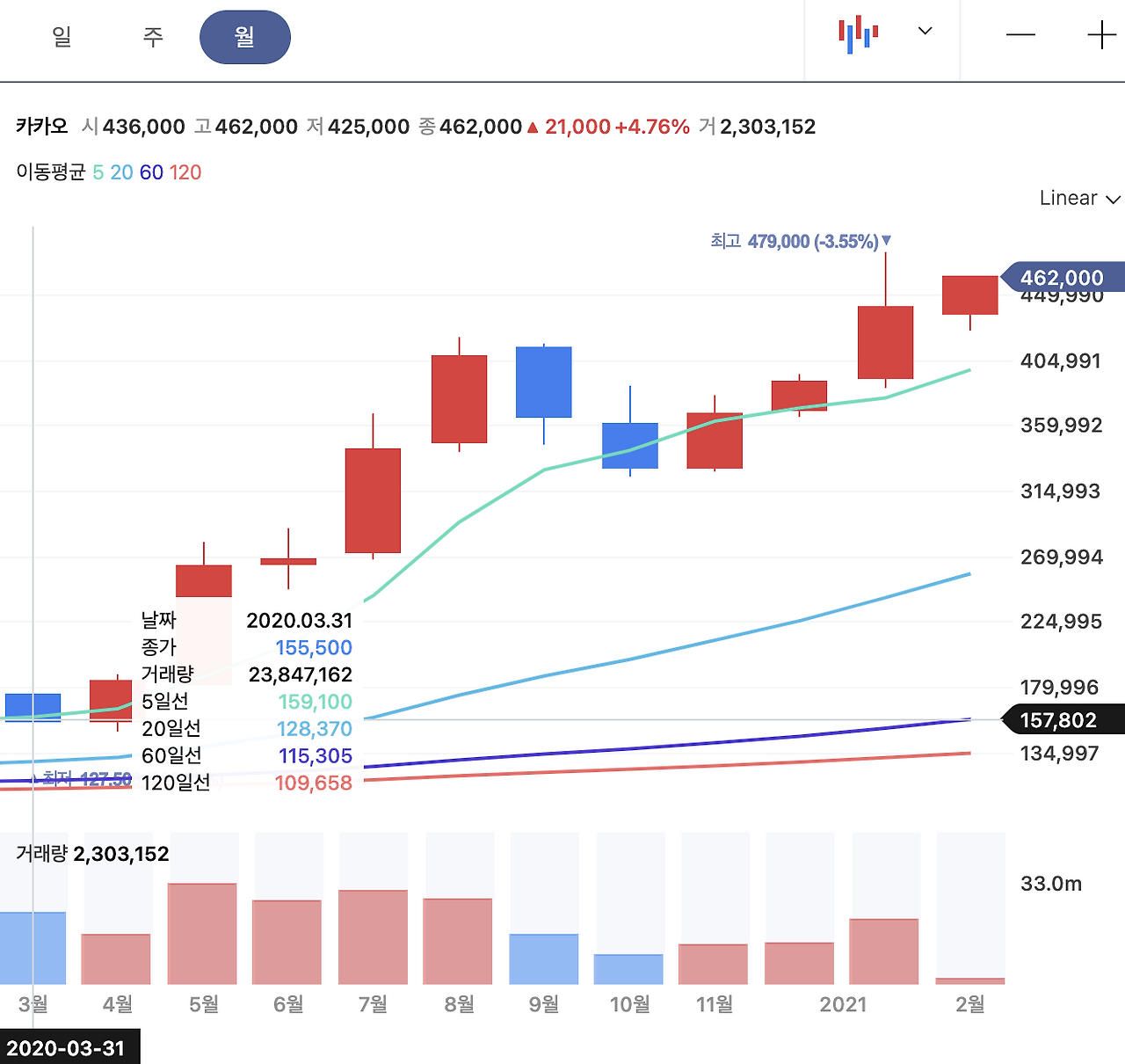 카카오가 4거래일 연속 종가 기준 신고가를 갈아치우며 시가총액 60조원(60조1525억원)을 처음으로.